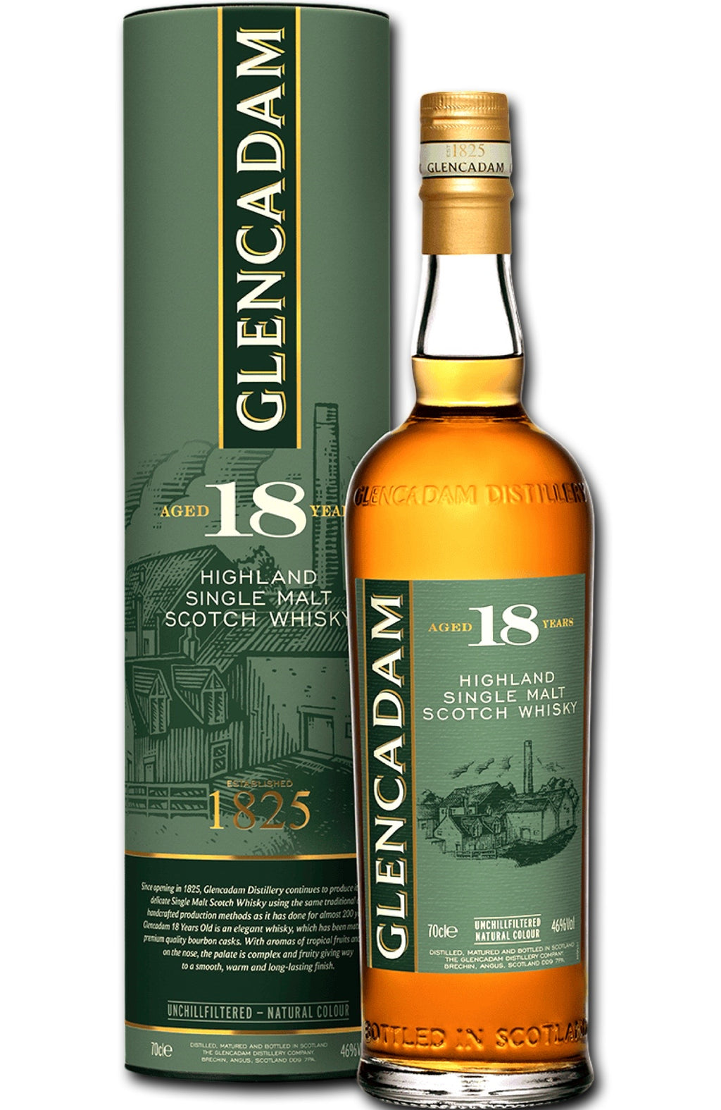 An 18 year old Glencadam bottled at 46% with neither chill filtration nor artificial colouring. It can be recognised by its green packaging.
